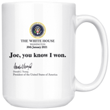 Our classic Joe You Know I Won mug but in a larger and better size. It proudly shows a message to Joe from the true President of the United States!
